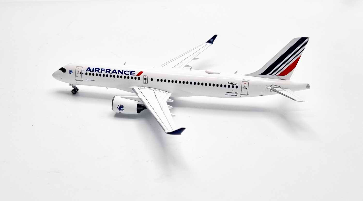 Splendide maquette de l’avion Airbus A220-300 aux couleurs de la compagnie Air France immatriculée F-HZUF Modèle en métal, décoration par tampographie et finition vernis Nombreux détails de grande qualité, antennes, pneus en caoutchouc. Modèle officiel produit sous licence